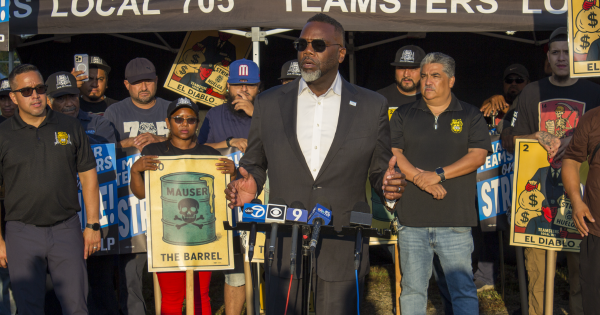 “I want to assure you that the mayor of Chicago stands firmly with Teamsters Local 705,” Johnson told the crowd. “The company needs to demonstrate that they know your value. There have to be protections to ensure that ICE agents do not get to run amok, to intimidate our workplaces. By you standing firm today, you are giving hope to neighborhoods across this city.”