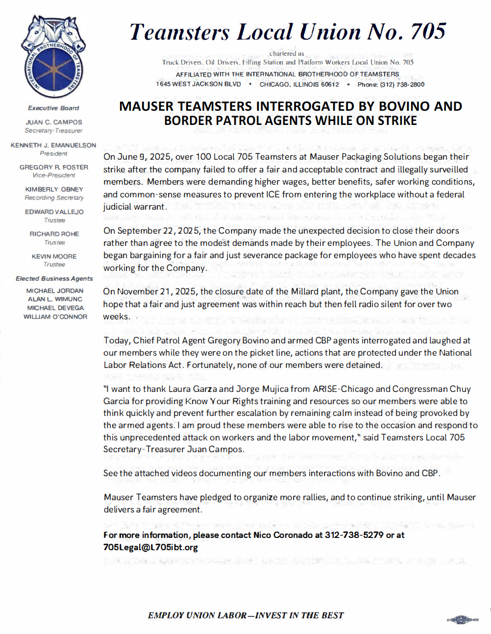 Today, Chief Patrol Agent Gregory Bovino and armed CBP agents interrogated and laughed at our members while they were on the picket line, actions that are protected under the National Labor Relations Act. Fortunately, none of our members were detained.
