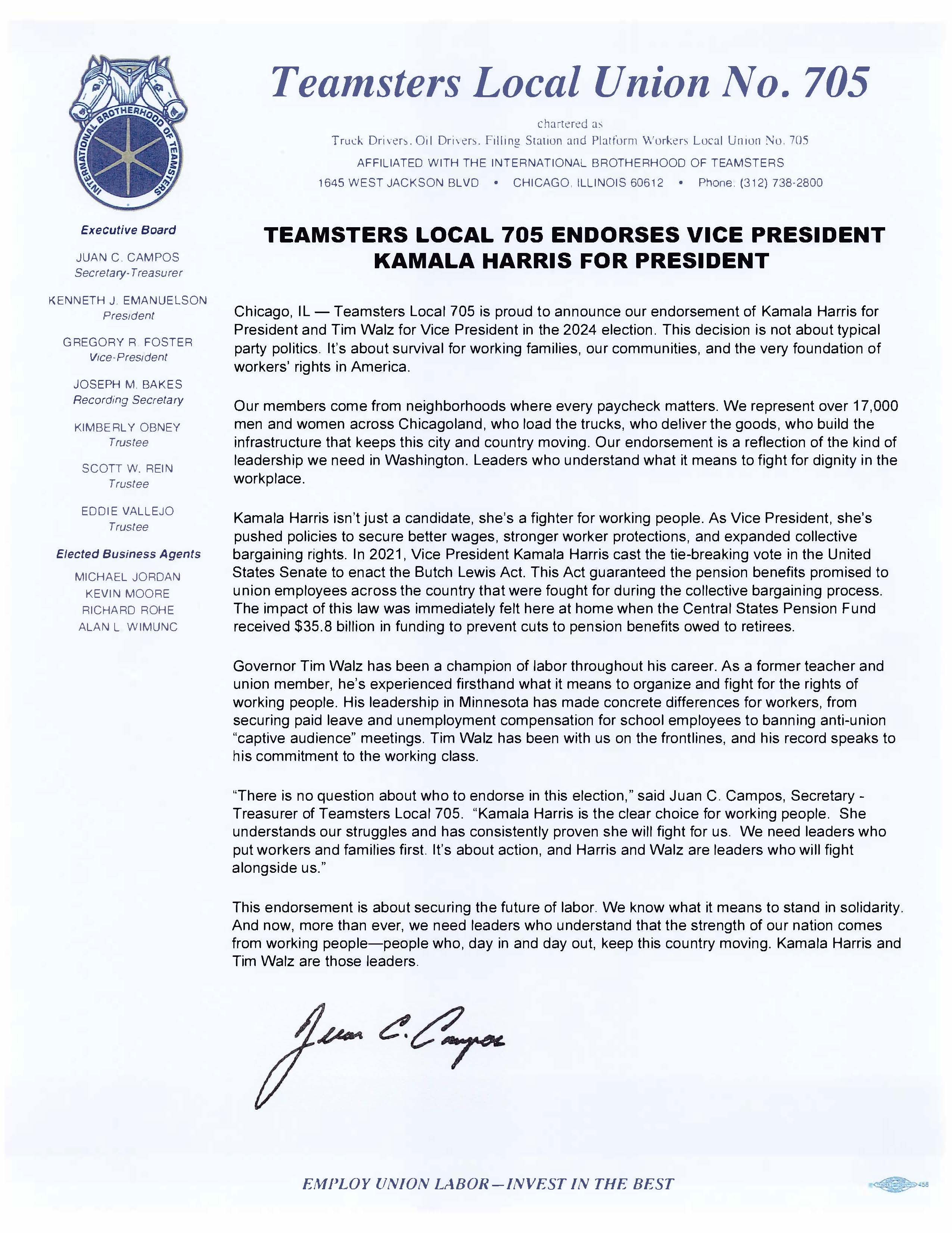 "There is no question about who to endorse in this election," said Juan C. Campos, Secretary-Treasurer of Teamsters Local 705. "Kamala Harris is the clear choice for working people. She understands our struggles and has consistently proven she will fight for us. We need leaders who put workers and families first. It's about action, and Harris and Walz are leaders who will fight alongside us."
